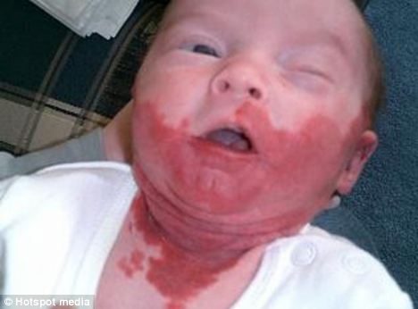 Beginning: The red mark as it started to form when Millie was just a few weeks oldBut just five days after she was born, Millie's 'bruise' changed colour from blue to a dark, blood red and started to change shape.