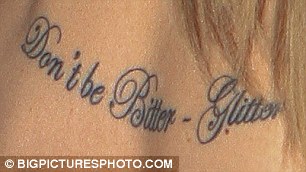 Looking healthy and happy, the 30-year-old star yesterday unveiled a motivating new tattoo which read 'Don't be bitter - glitter' written across the top of her back in swirling script.