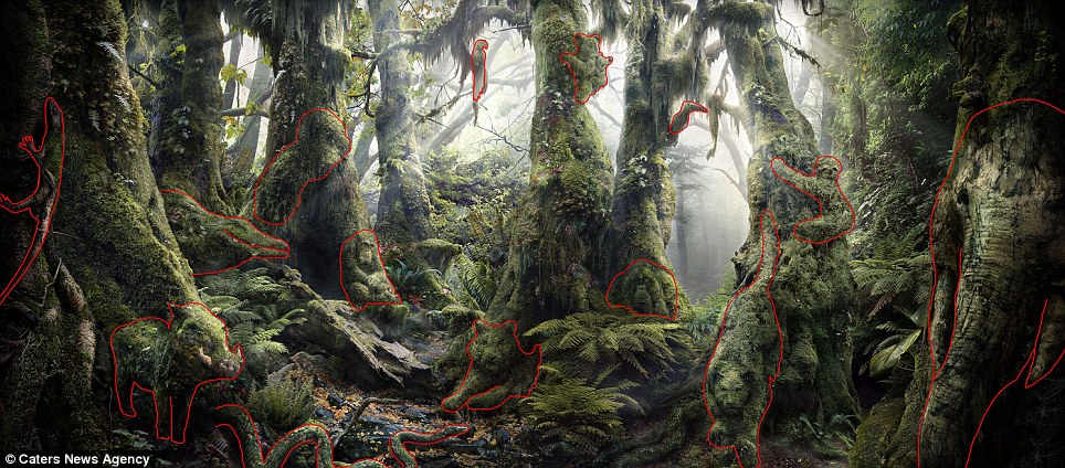 Endangered: The camouflaged animals can be seen marked with a red outline revealing those most affected by deforestationThe poster - part of campaign to highlight the damage of deforestation - was aimed at getting the public to take a moment to consider how many animals could be lost if deforestation continues at it's current rate.