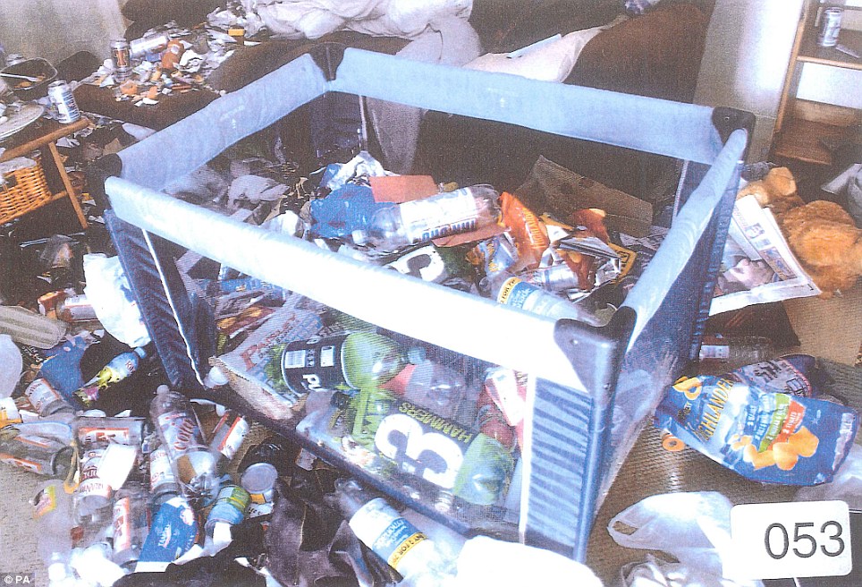 Barely room to walk: Photos taken by investigators also show several empty vodka bottles, Dorito packets, clothes alongside a bag of nappiessource: dailymail