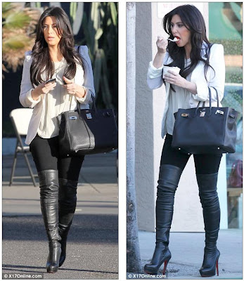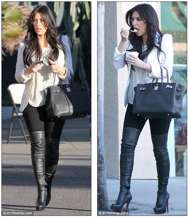 Monochrome maiden: Kim stepped out in a black and white ensemble which she teamed with a pair of over the knee boots and her favourite Hermes Birkin bag