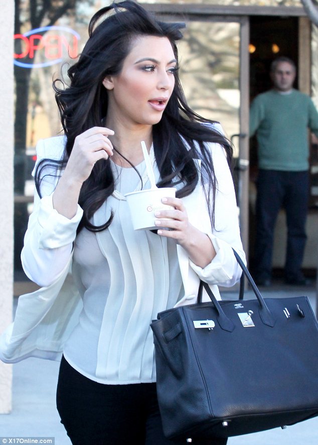 She was also seen carrying her favourite black Hermes Birkin handbag on her arm as she tucked into the healthy snack.