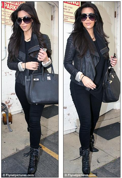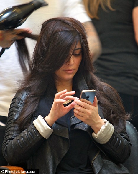Keeping busy: Kim was busy on her phone throughout her hair appointmentKim wore an all-black outfit of tight jeans, T-shirt and leather jacket teamed with biker boots and huge sunglasses.