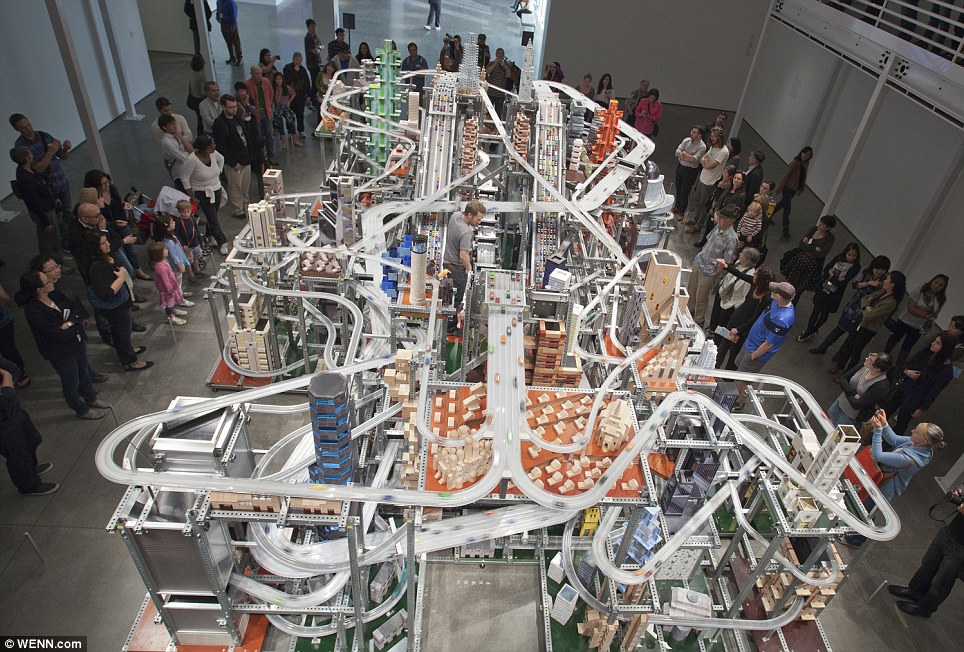 Intricate design: Crowds gather at a preview of Metropolis II - based on the cult film from 1927 - at the gallery in Los AngelesSculptor Chris Burden told ABC: 'They can crash, they can fly off the track, they can bump into each other.'