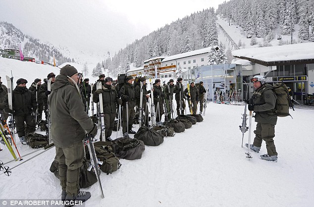 Soldiers of the Austrian armed force, pictured search for a missing 15-year-old on Sunday in the ski area of Axamer Lizum. A number of inexperienced skiers including children have had to be airlifted from the snowYesterday authorities in the region raised the avalanche warning to stage three, or ‘considerable risk’, and holidaymakers were advised to stay indoors.