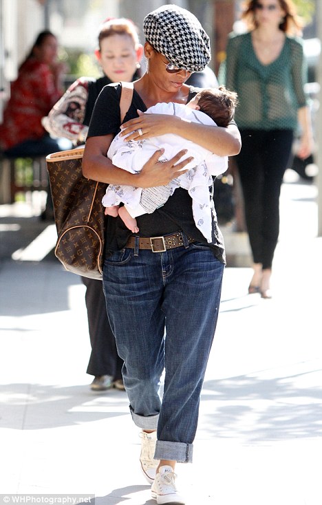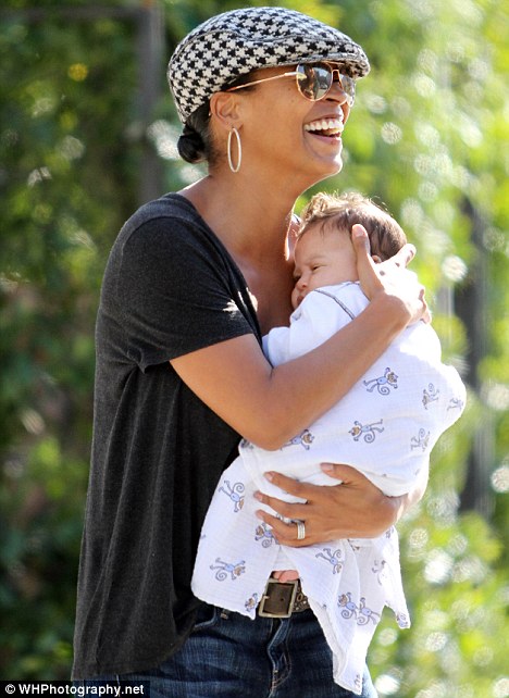 Doting mother: While the pregnancy was unplanned, Nia looked overwhelmed with happiness as she stepped out with her bundle of joyThe little boy is the first child for Nia, 41, and basketball player husband Ime Udoka. Nia also has a 10-year-old son, Massai, with former boyfriend Massai Z. Dorsey.