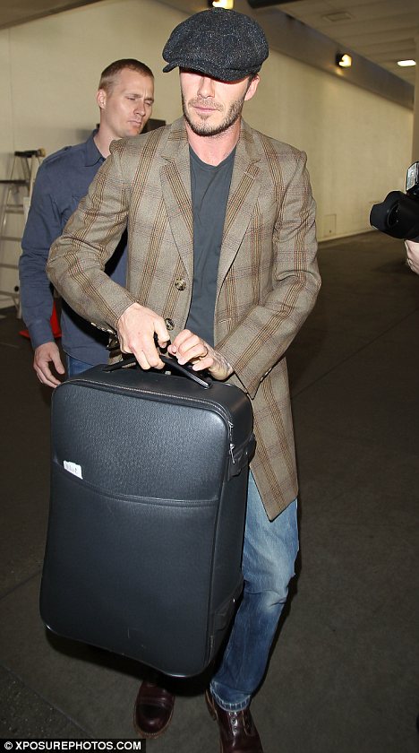 David was sporting a checked brown blazer, grey T-shirt, blue jeans, patent brown leather shoes and a black tweed baker cap that shielded his eyes as he hauled his suitcase from the airport.